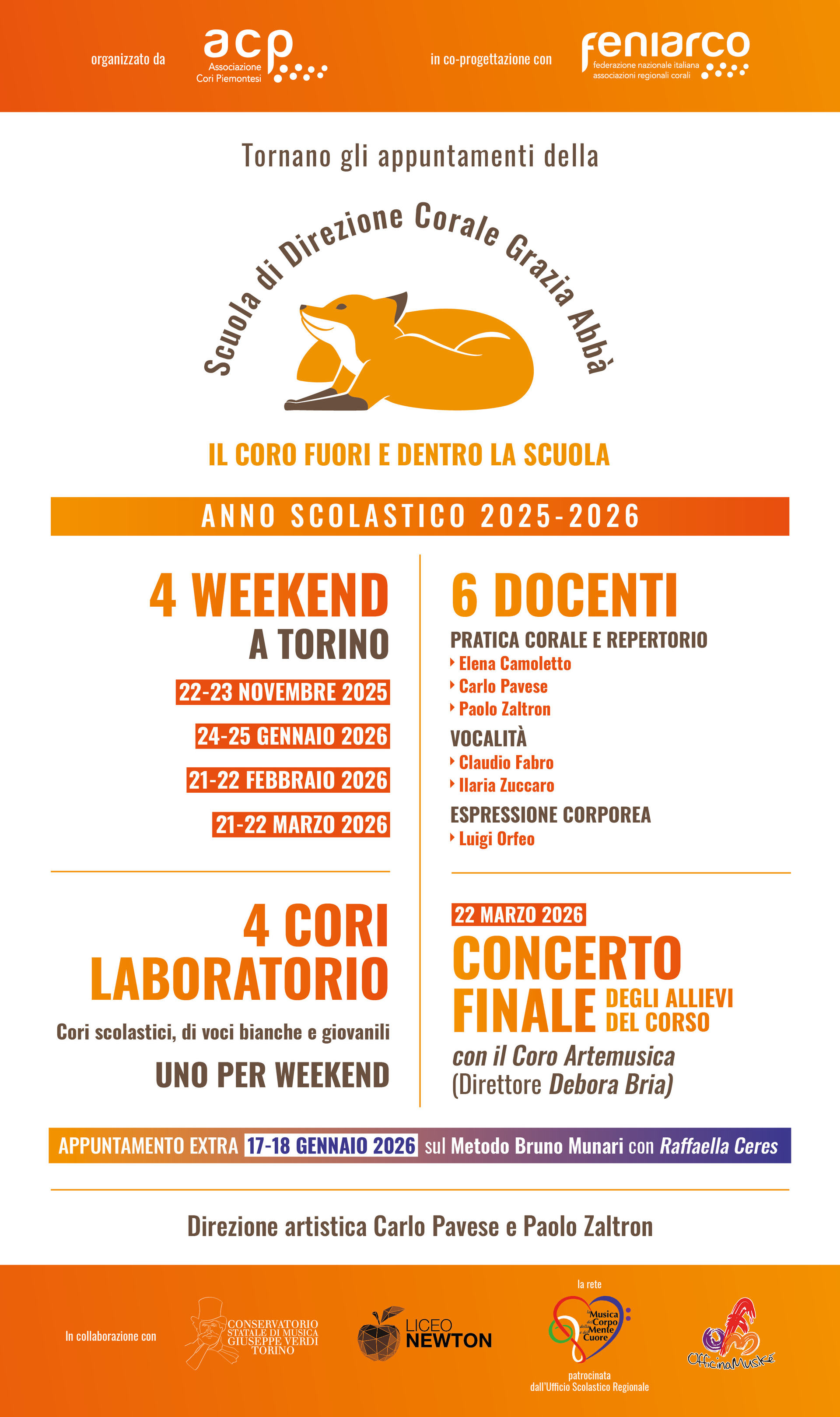 Giunta alla quarta edizione, la Scuola di Direzione Corale Grazia Abbà, promossa da ACP – Associazione Cori Piemontesi in co-progettazione con Feniarco e in collaborazione con scuole, associazioni e istituzioni del territorio, torna a Torino per offrire un percorso formativo dedicato a chi opera – o desidera operare – nel mondo del canto corale scolastico.