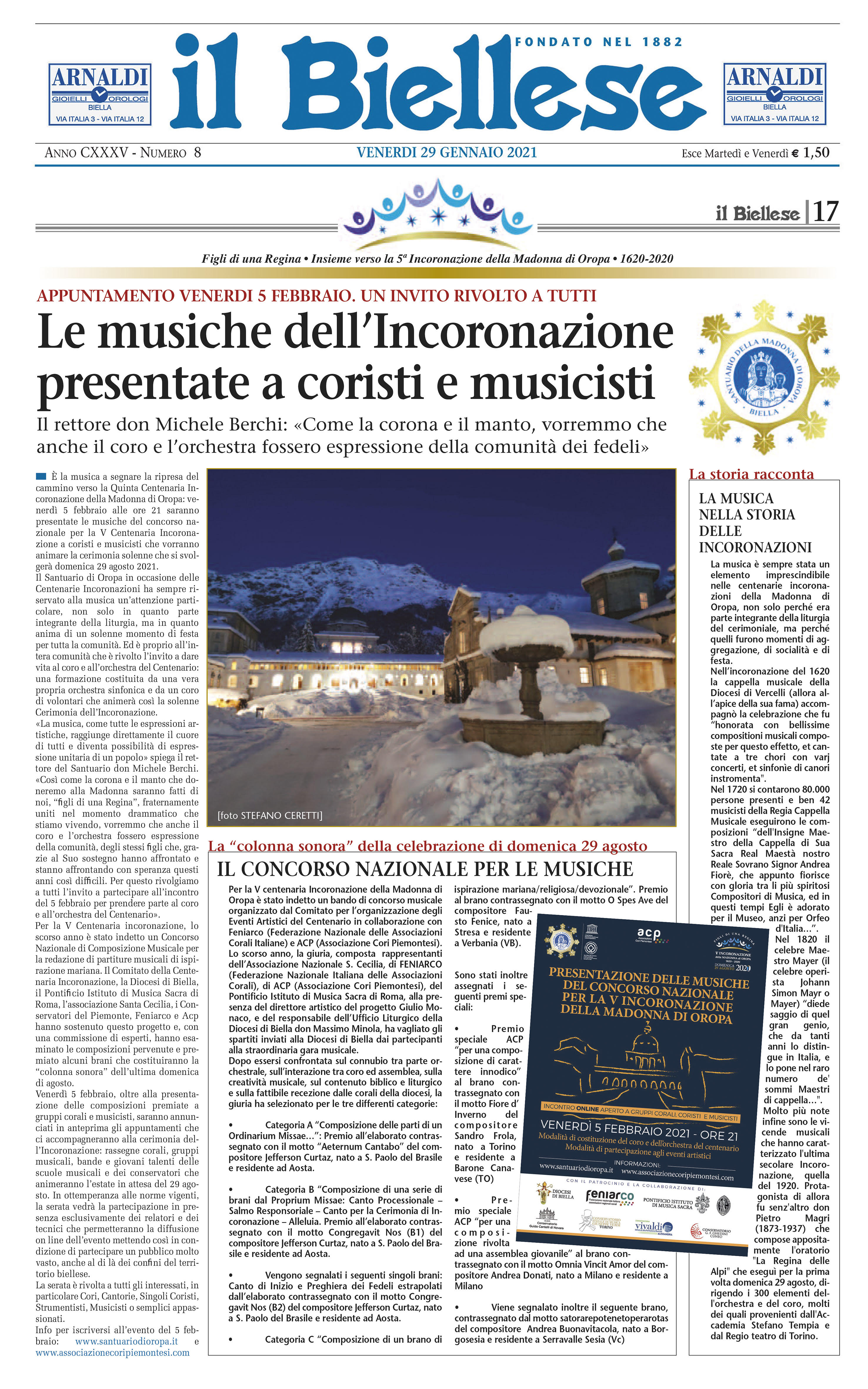 Venerdì 5 febbraio, presentazione delle composizioni premiate al Concorso Nazionale di Composizione Musicale per la redazione di partiture musicali di ispirazione mariana indetto lo scorso anno in occasione della V Centenaria incoronazione della madonna di Oropa (BI).
