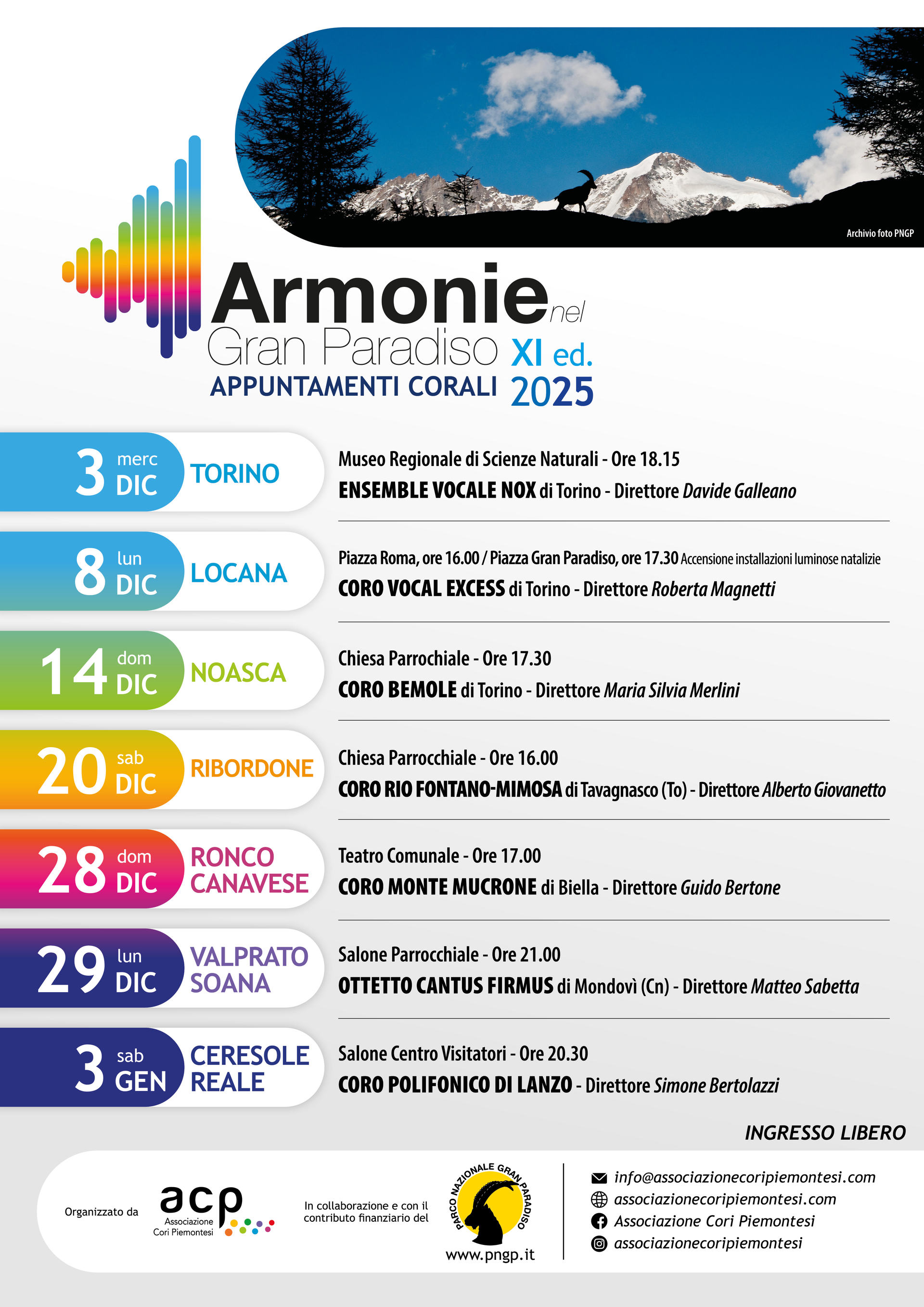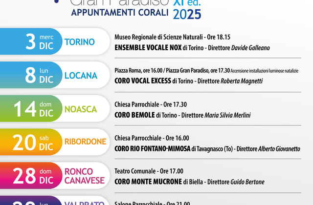 Dal 3 dicembre 2025 al 3 gennaio 2026, diverse formazioni corali provenienti da tutto il Piemonte si esibiranno, portando melodie natalizie e repertori polifonici nei borghi, chiese e teatri del territorio del Parco Nazionale del Gran Paradiso.
