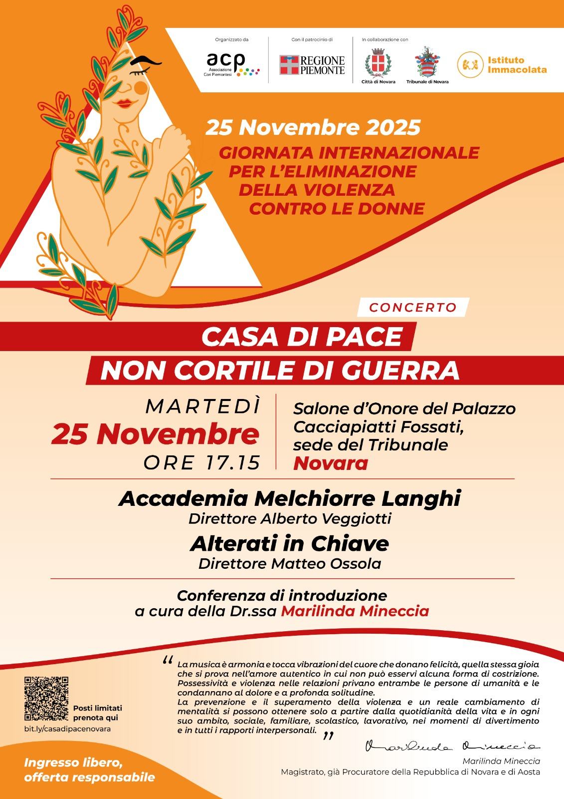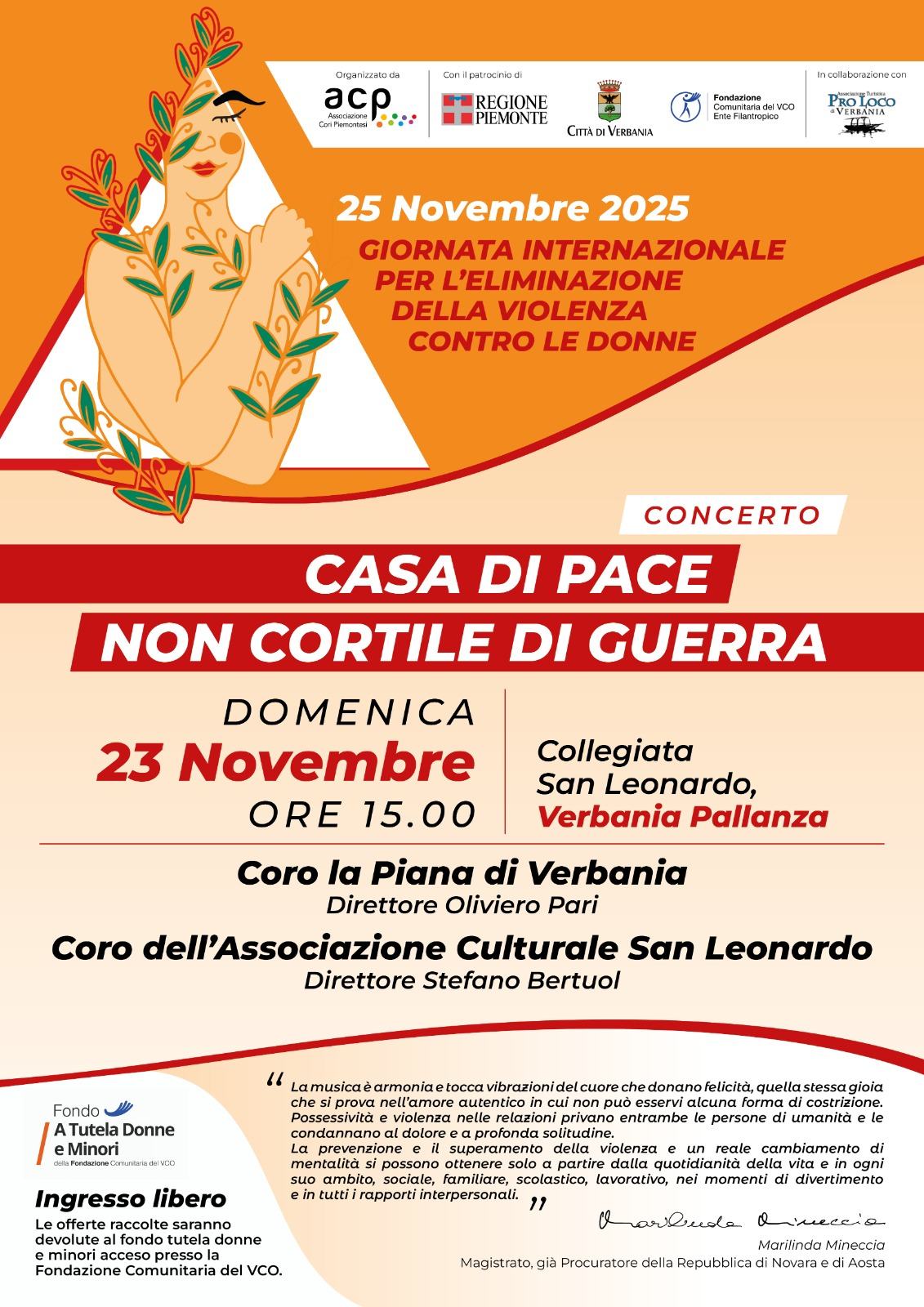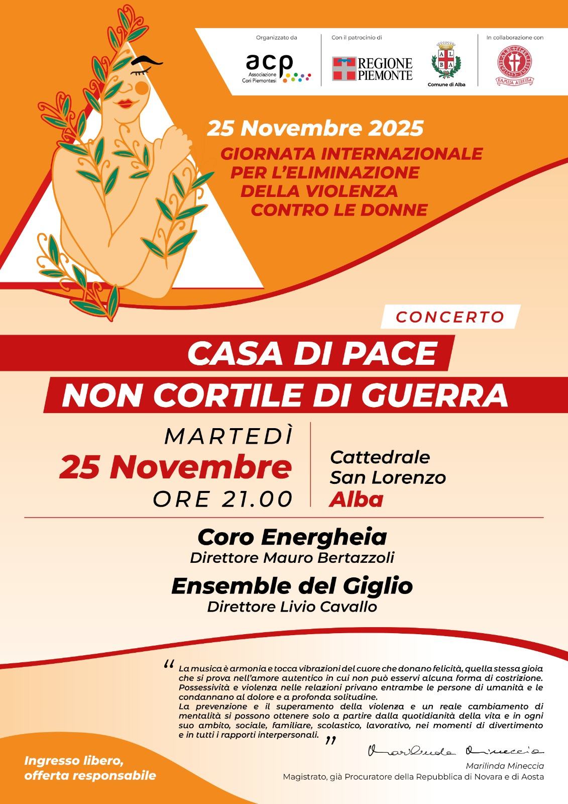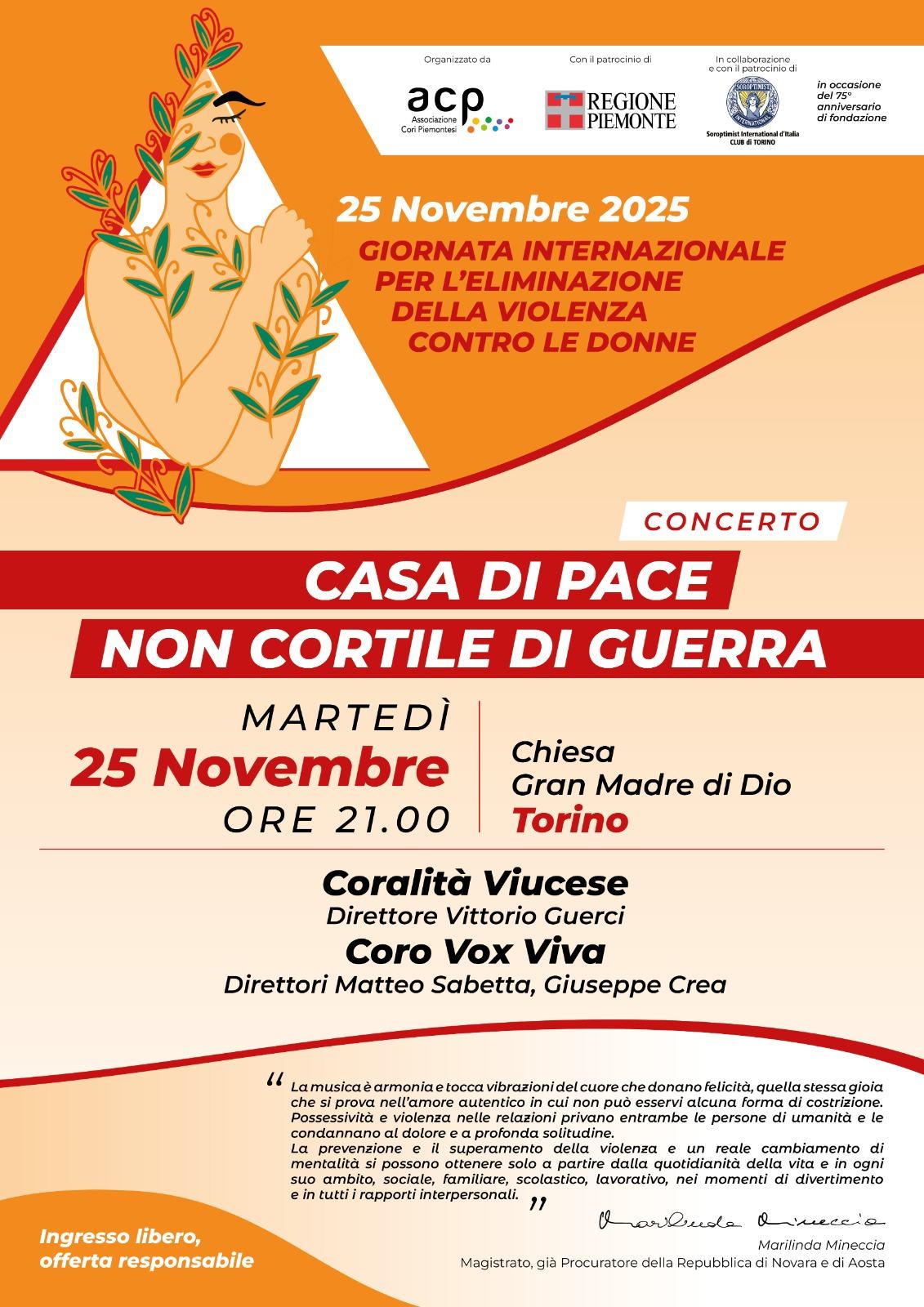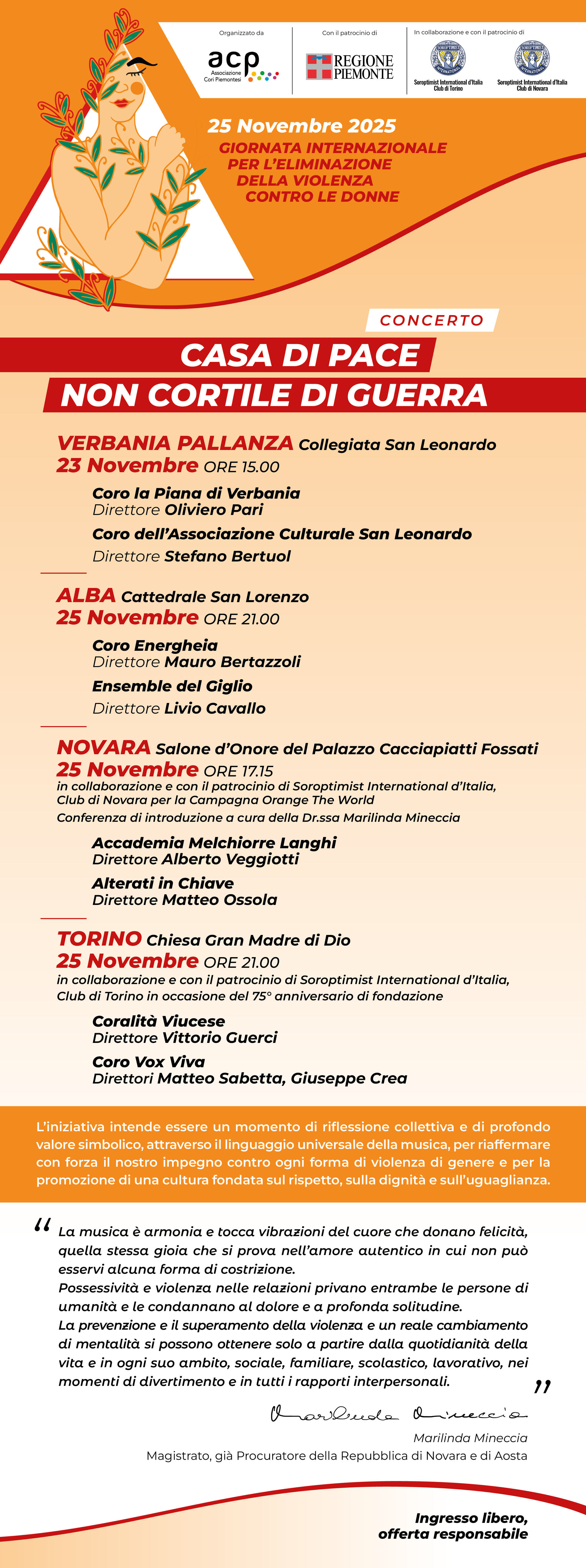 In occasione della Giornata Internazionale per l’Eliminazione della Violenza contro le Donne, l’Associazione Cori Piemontesi promuove un progetto che unisce musica, riflessione e comunità. Domenica 23 e martedì 25 novembre, in quattro province piemontesi prenderanno vita i concerti corali “Casa di Pace e non Cortile di Guerra”, un titolo che vuole essere un invito, un monito e una speranza.